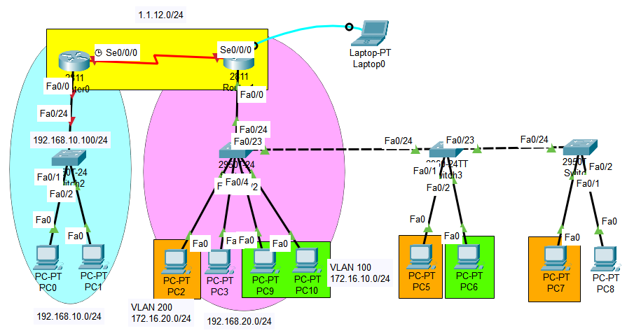 위의 구성은 192.168.10.0/24 주소 대역을 가지는 네트워크이며, 172.16.10.0/24 주소 대역을 사용하는 VLAN 100과 172.16.20.0/24 주소 대역을 사용하는 VLAN 200으로 구성되어있다. (각 PC의 IP 주소는 Static으로 설정한다.)