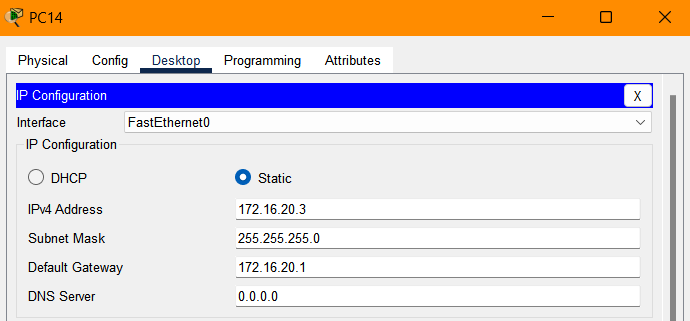 PC12과 PC14는 VLAN 200을 사용할 예정이므로, 172.16.20.0/24 주소 대역으로 설정한다.